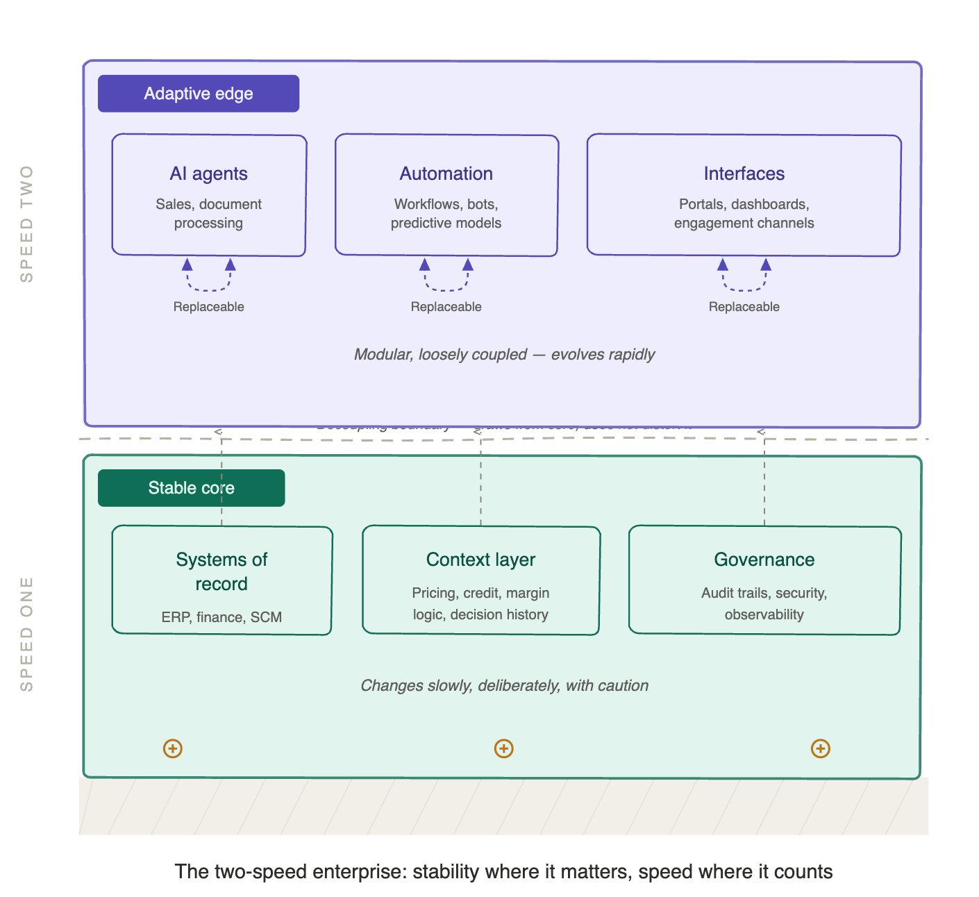 Speed One (Stable Core): systems of record, data models, decision logic and governance. These change slowly and deliberately.