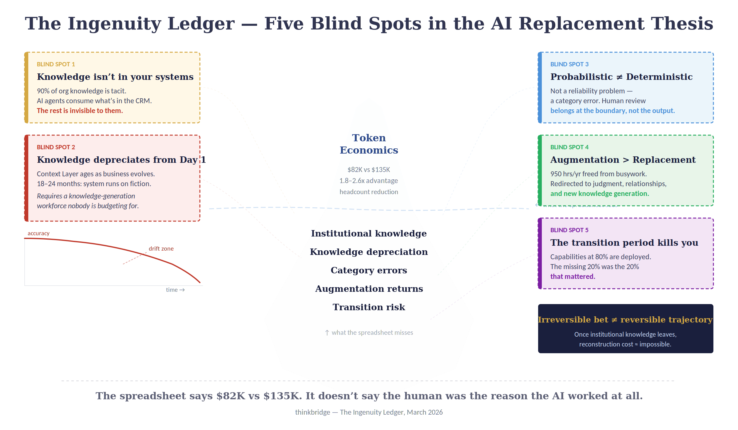 The AI replacement thesis has a compelling spreadsheet behind it. In a companion analysis — The Token Economy — I built that spreadsheet: token consumption, infrastructure costs, error and risk layers, five-year forecasts across three pricing scenarios. The fully loaded cost of an AI agent comes to roughly $82,000 per year at a 20-agent mid-market deployment, against $135,000 for the human it replaces. Even after accounting for subsidized token pricing, hallucination risk, and the full infrastructure stack, the economics deliver a 1.8–2.6x cost advantage at scale.