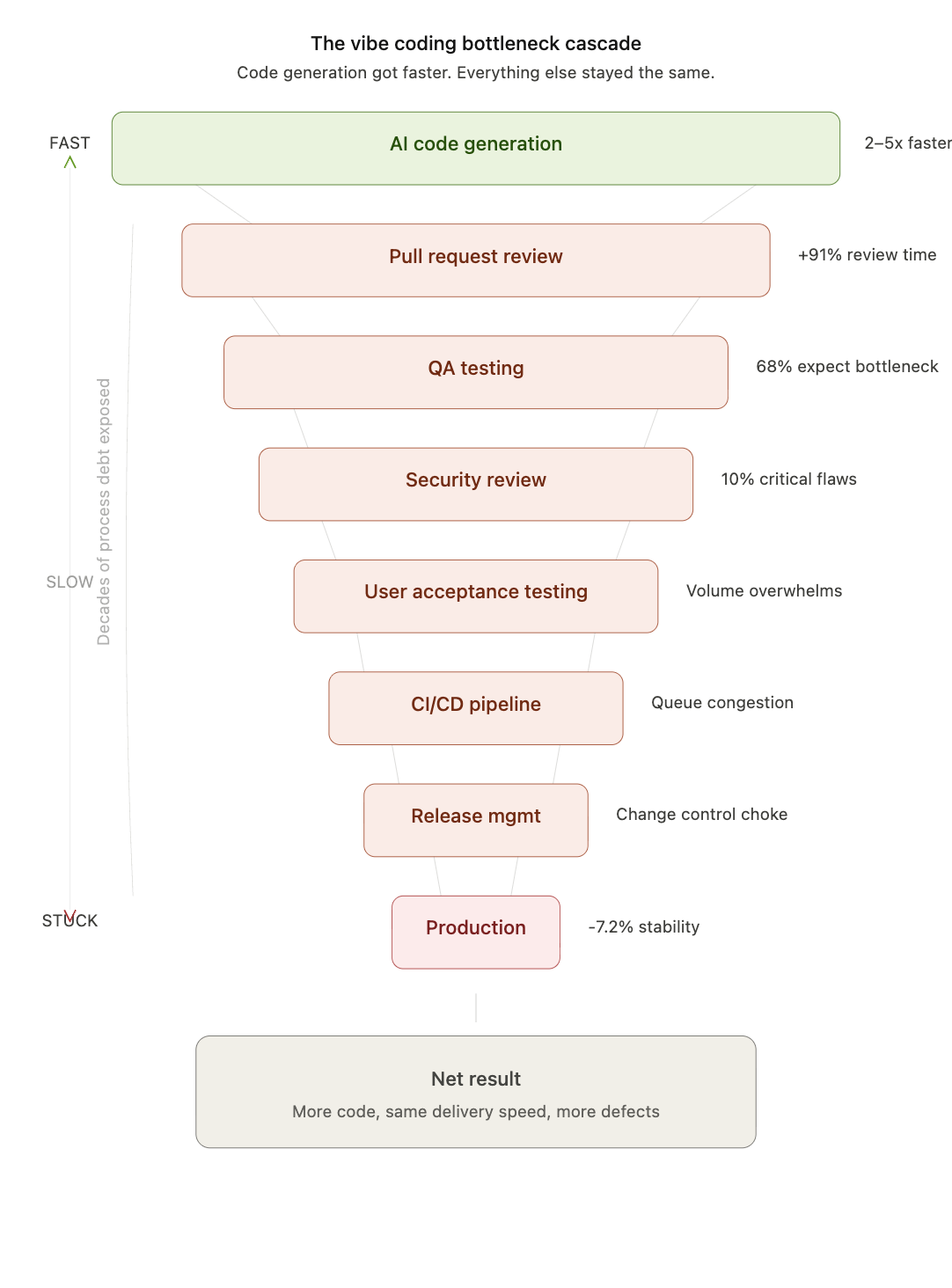 The explanation is not complicated, but it requires abandoning a comforting fiction: that software delivery speed is determined by how fast you write code. It is not, and it never was. Writing code has not been the binding constraint on enterprise software delivery for decades. The binding constraints live downstream — in review, in testing, in validation, in release coordination, in production operations. Vibe coding did not remove those constraints. It simply moved the flood of work-in-progress upstream of them, faster than anyone anticipated.