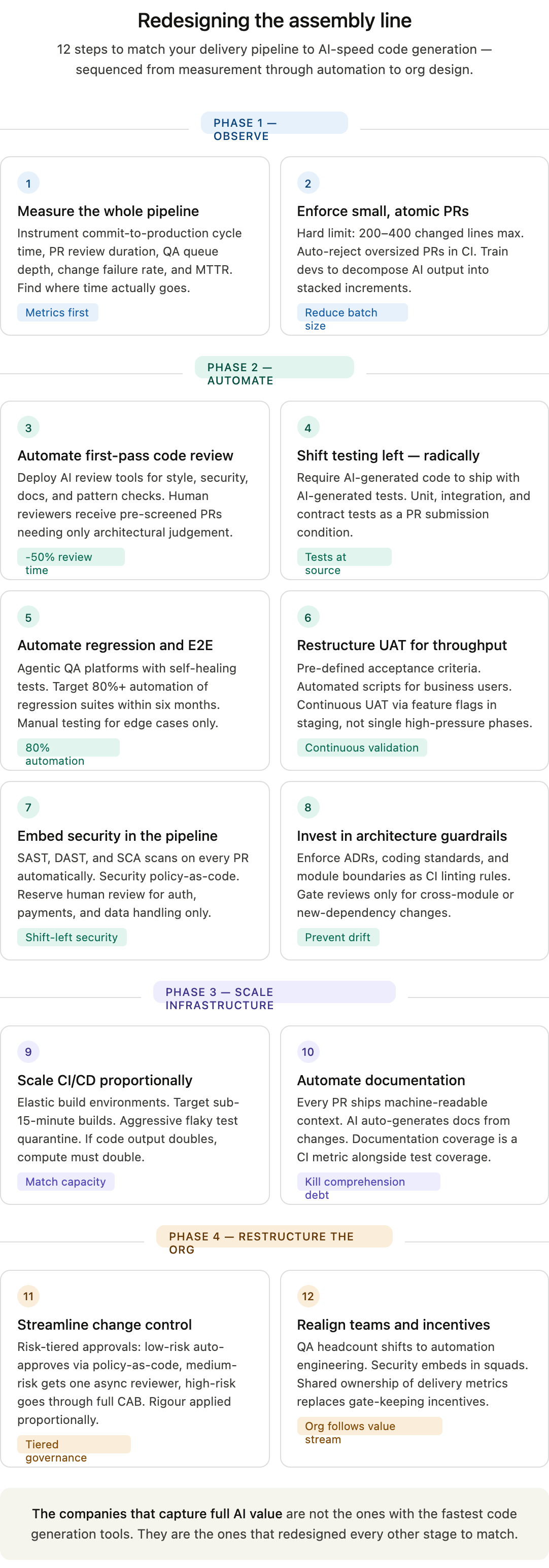 The solution is not to slow down code generation. It is to accelerate, automate, and restructure every other stage of the delivery pipeline to match the new throughput. This requires process re-engineering, not tool shopping.