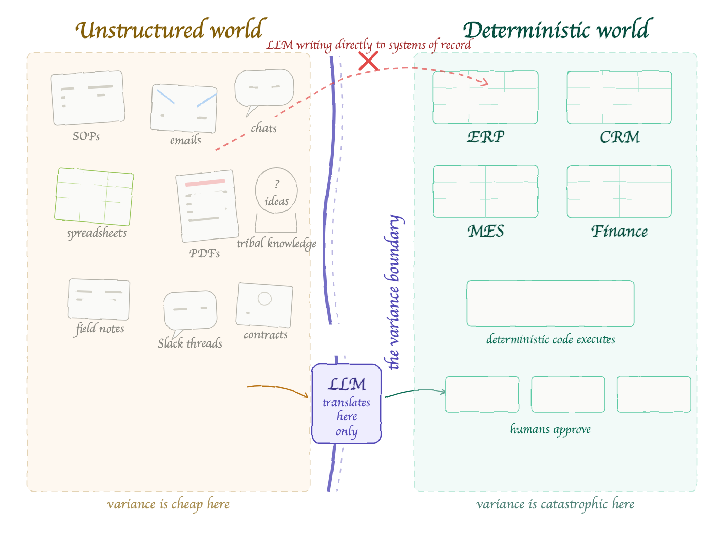 The architecture that follows from this insight is not “LLM replaces the process” but “LLM sits at the boundary between unstructured and structured information, feeding deterministic systems that execute the business logic.” The LLM translates. Code validates. Humans approve. Systems of record execute.