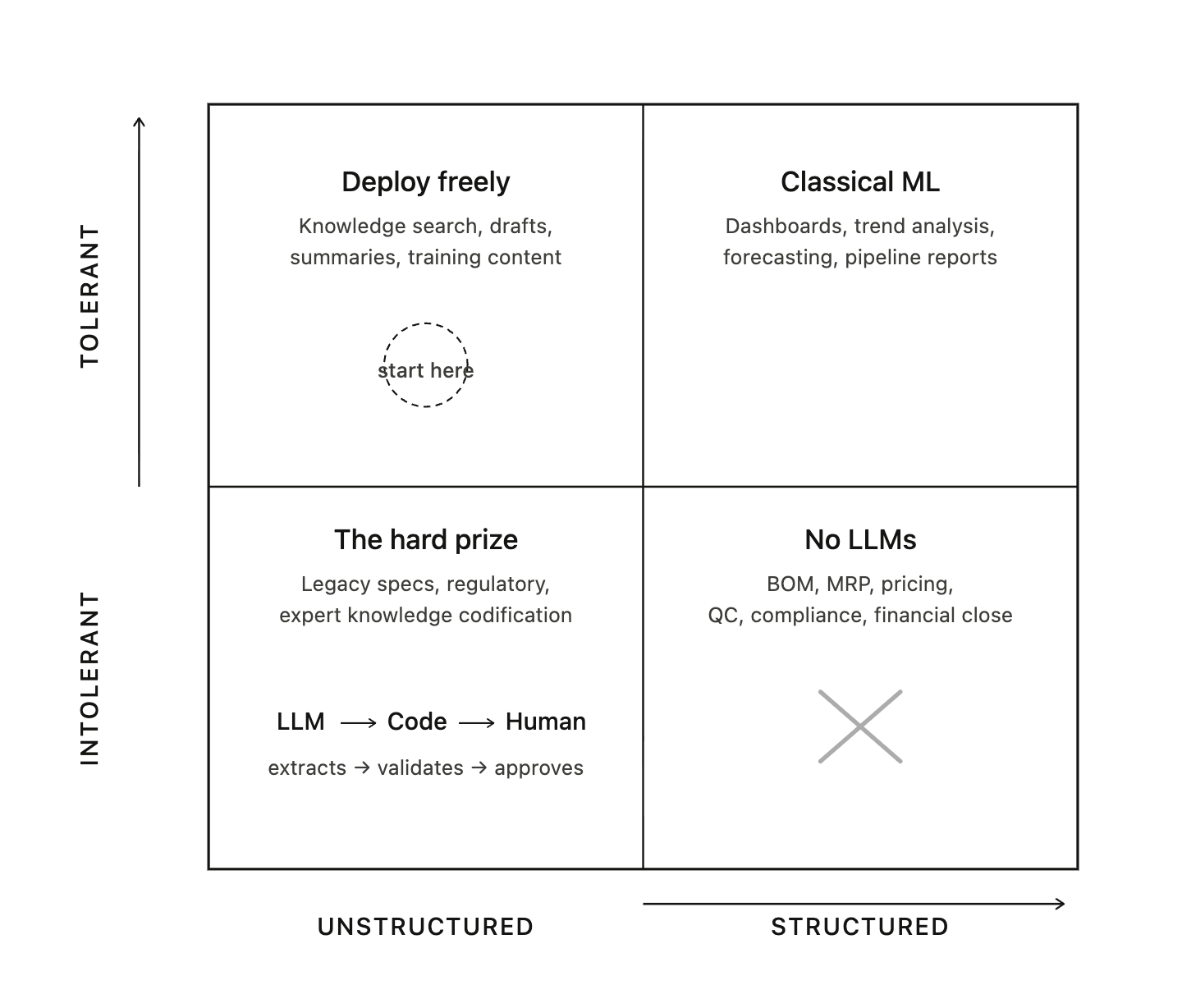 Quadrant 3 — Variance-Intolerant, Structured Data. No LLMs in the execution path. Use deterministic code, validated formulas, rule engines. LLMs may serve as a front-end translation layer — converting a natural language request into a structured system query — but the system executes the logic. BOM validation, MRP calculations, financial close, regulatory filings, quality pass/fail.