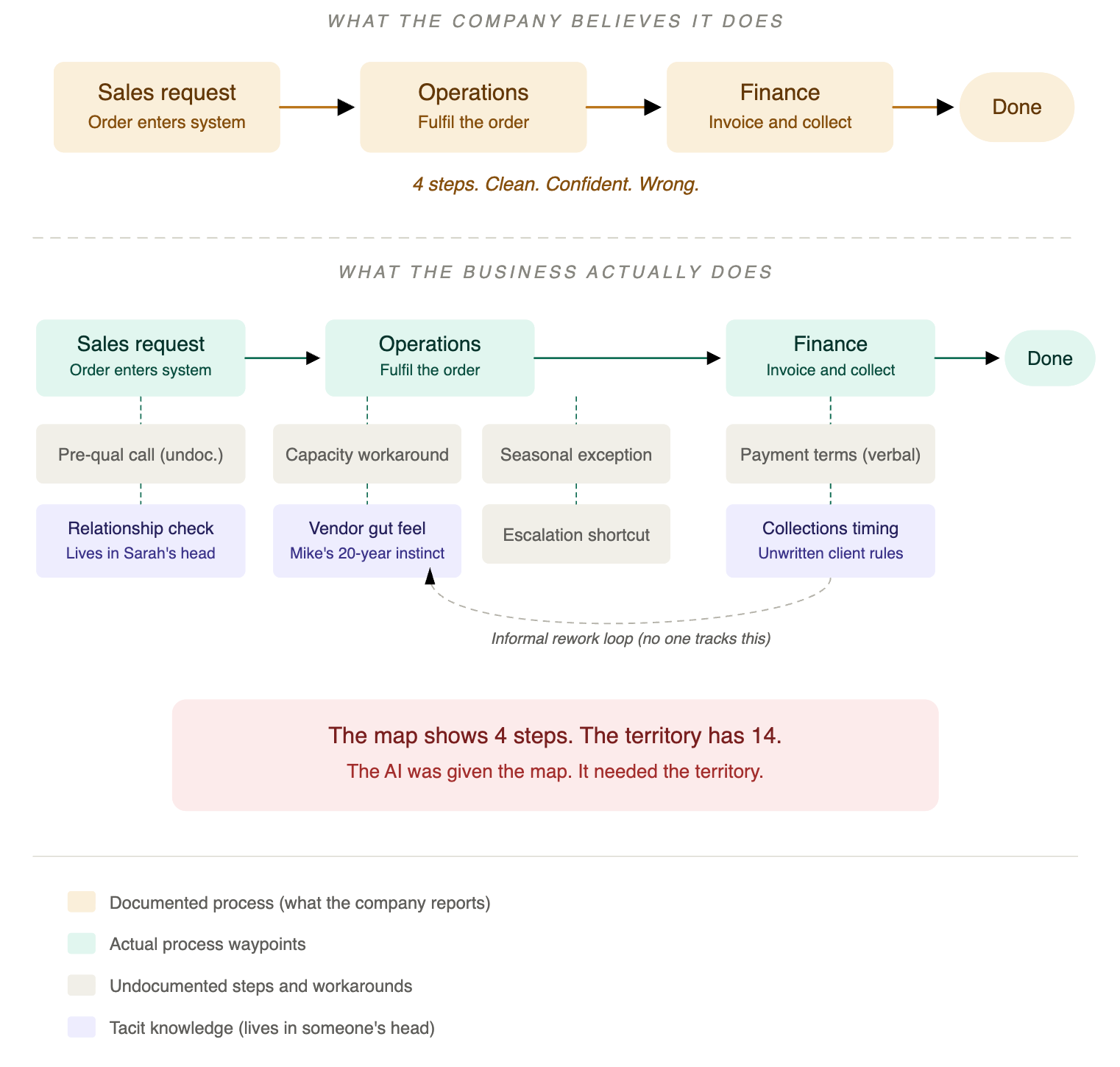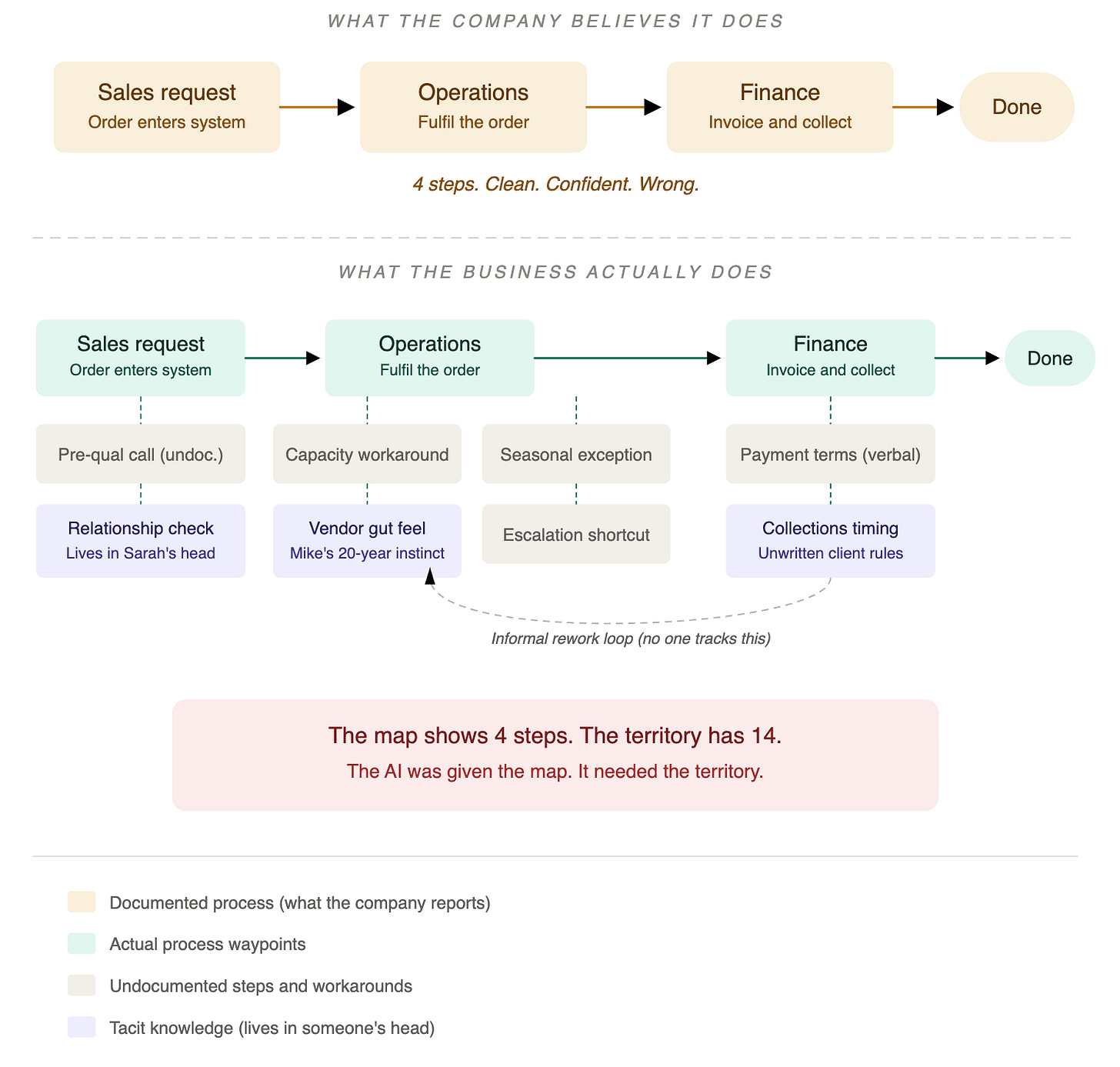 Every business has an official version of how it operates. It lives in process documentation written during the last ERP implementation, in org charts that reflect reporting lines but not decision flows, in SOPs that describe how work should happen rather than how it does happen. This official version is what gets presented to consultants, auditors, and now — fatally — to AI vendors designing automation workflows.